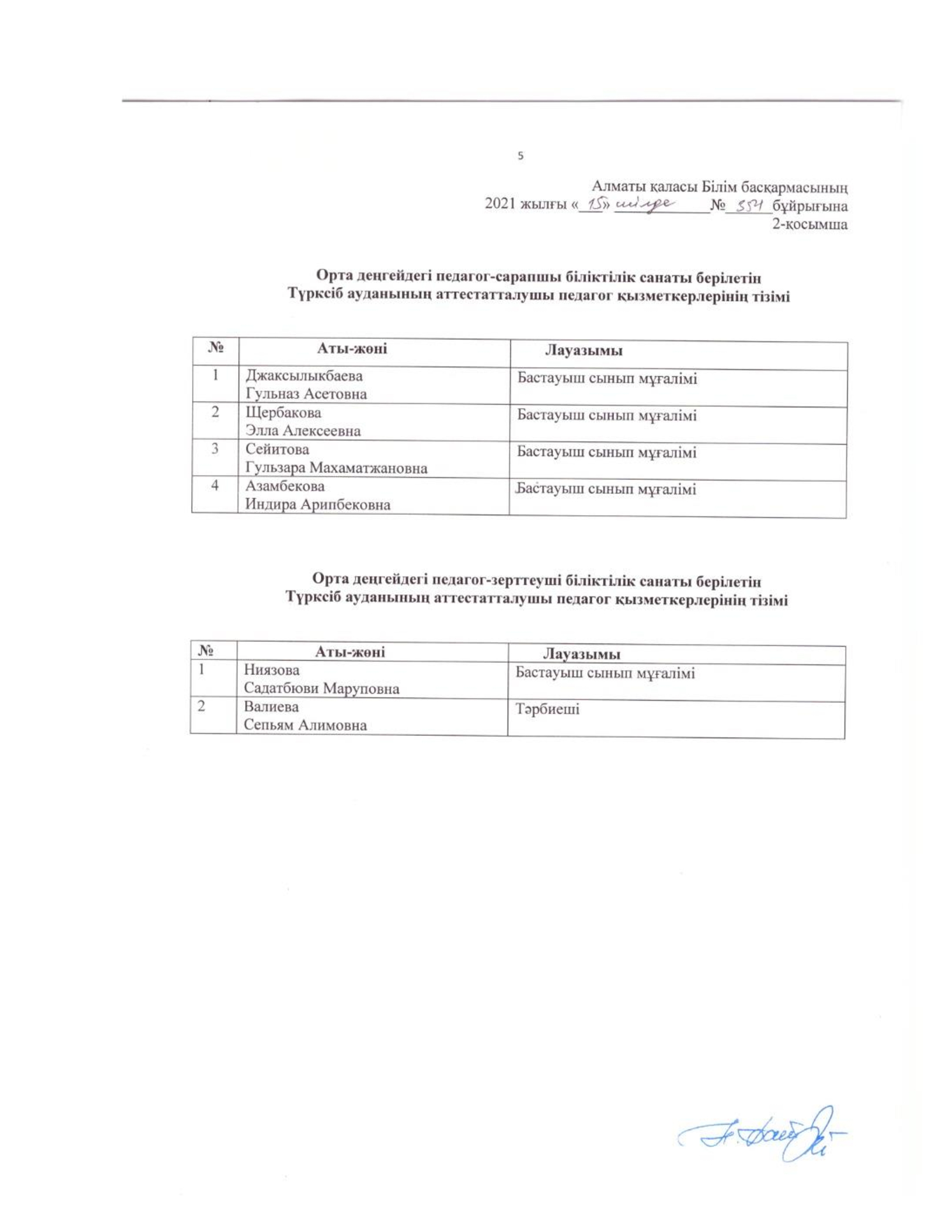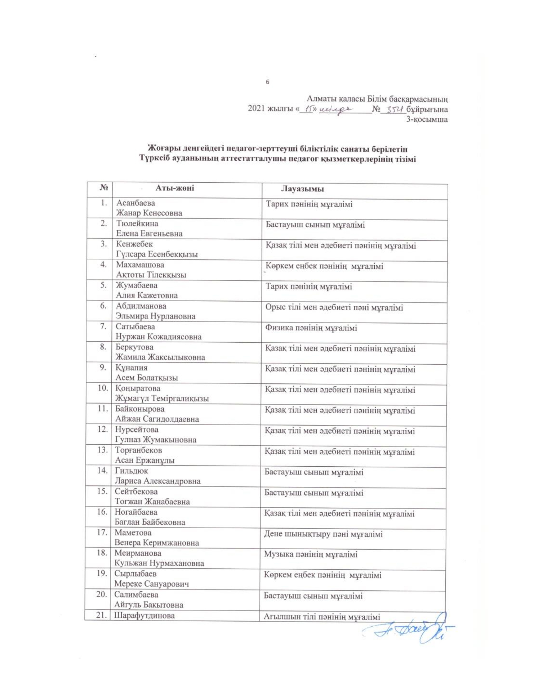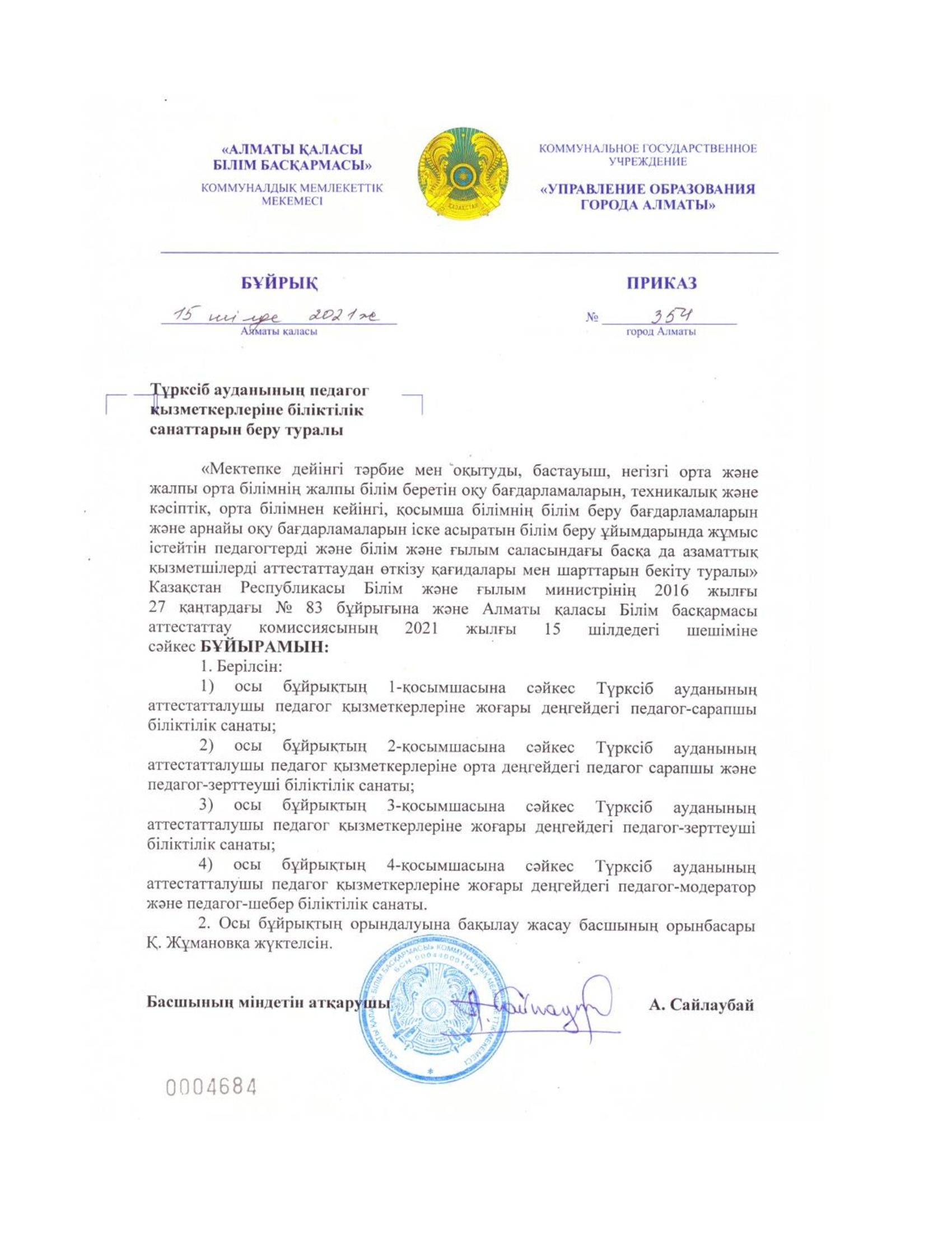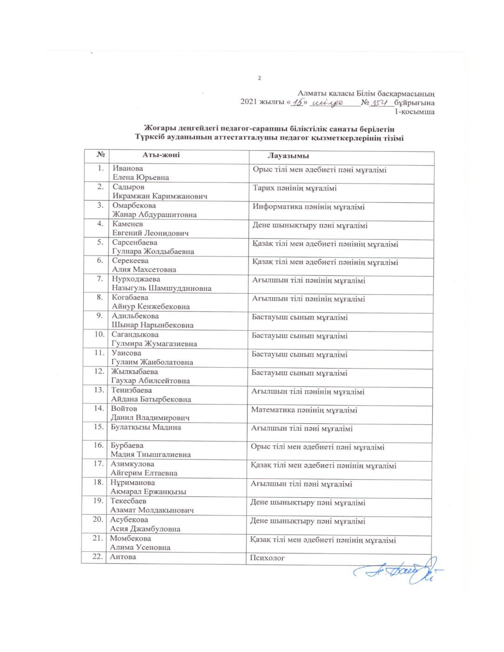 13 қыркүйек 2021 0 1 2 3 4 5 2021 жылы аттестаттаудан өткен педагогтер Алматы қаласы Білім басқармасының 2021 жылдың 15 шілдедегі №354 бұйрығы.Түрксіб ауданы педагогтеріне біліктілік санаттарын беру туралы