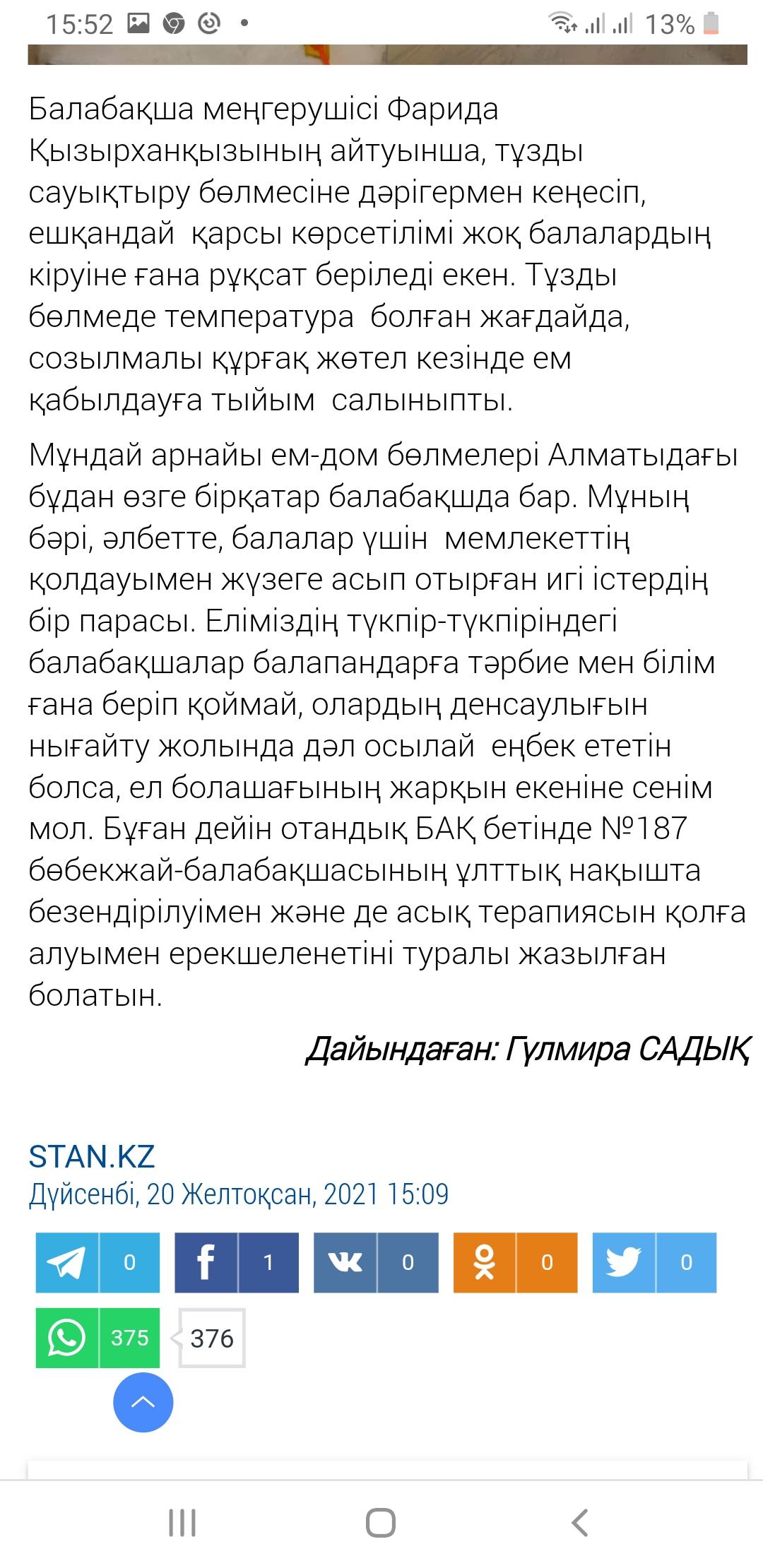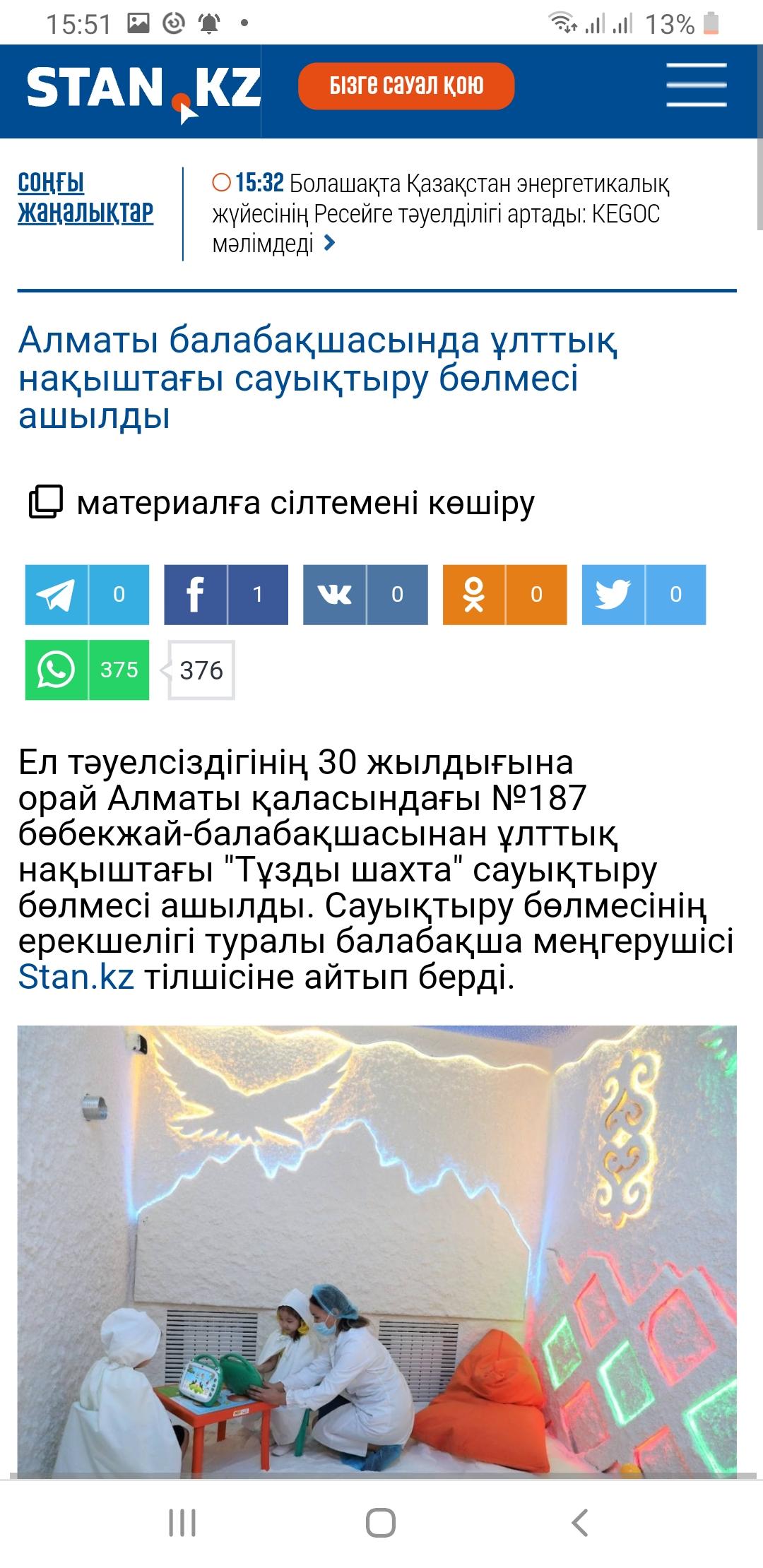 20 желтоқсан 2021 0 1 2 3 4 5 Stan.kz "Алматы балабақшасында ұлттық нақыштағы сауықтыру бөлмесі ашылды.